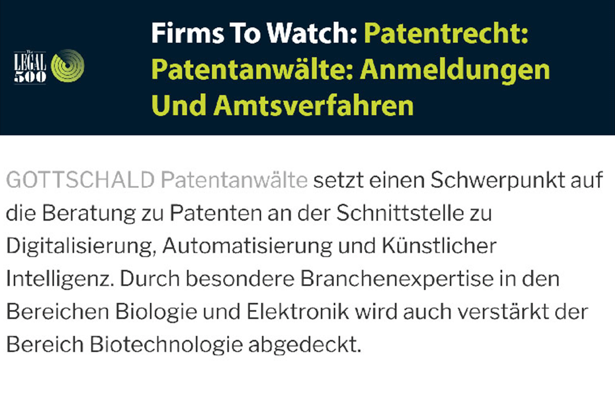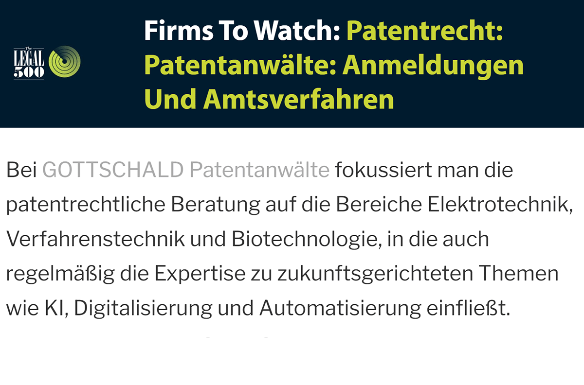 Die Partner der GOTTSCHALD Patentanwälte sind verantwortlich im Sinne des Presserechts und des § 6 des Mediendienste-Staatsvertrages.
